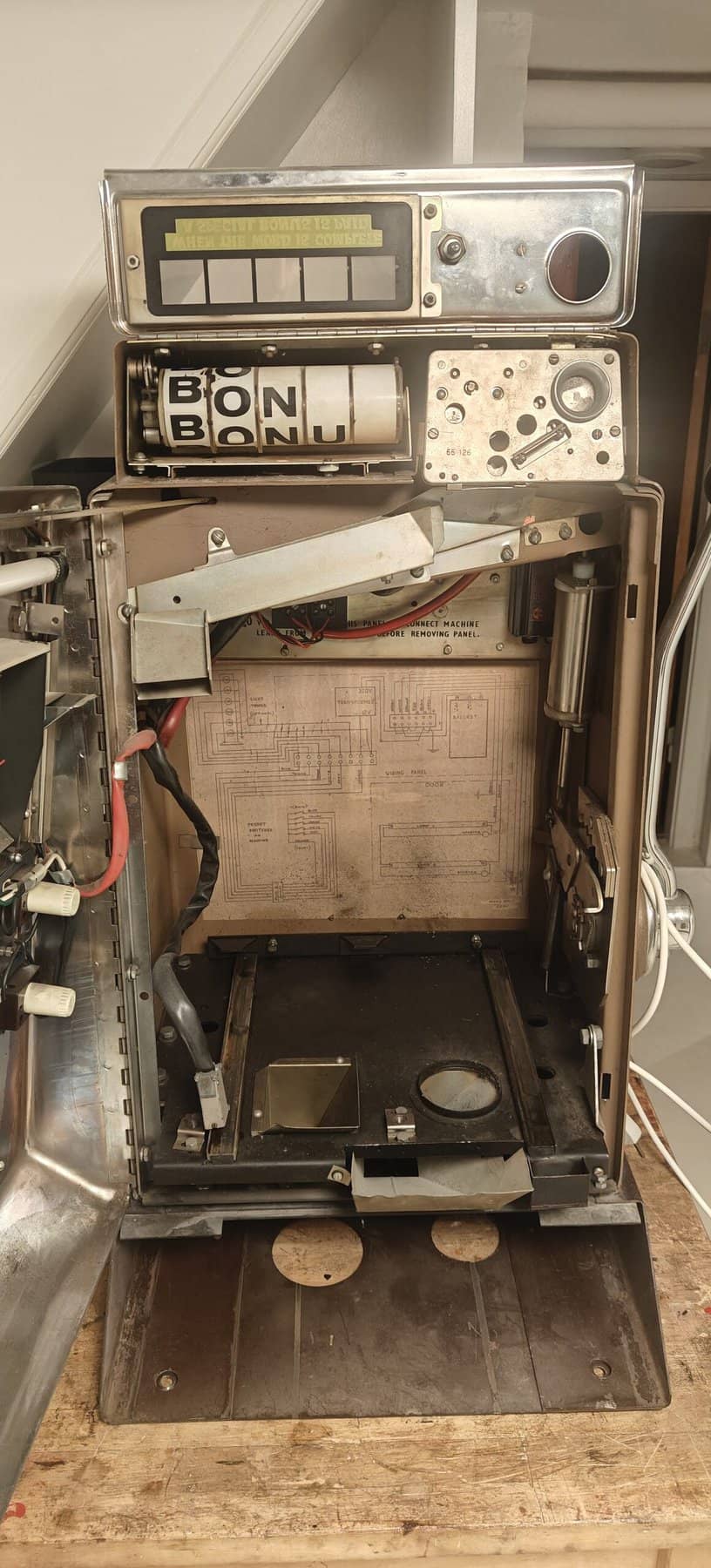 Typisk støder man på Tic, Tac Toe eller Mad Melons – Men en sjældent gang imellem støder man også på denne (mere eftertragtede) “Magic Spell” variant. Ud over en fræk heks på fronten (som jeg vist har glemt at affotografere), også byder på en BONUS ordning som man ser i toppen af maskinen.