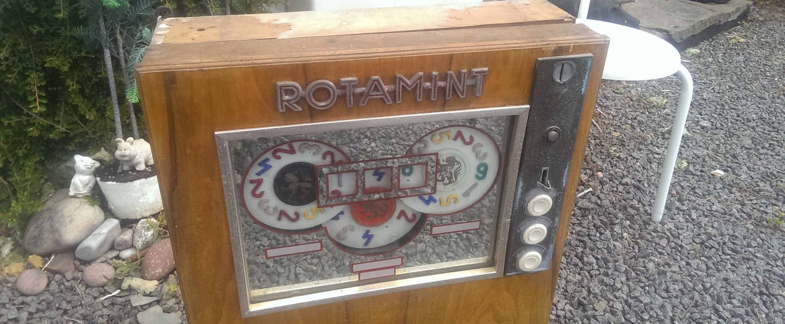 I forbindelse med et besøg til Bornholm, slog jeg vejen forbi der hvor vores Rotamint automaten pt. befinder. Det gav lejlighed til lidt nærmere inspektion af maskineriet, som faktisk lader til at være i bedre stand end først antaget. Sågar pengekassen er intakt.